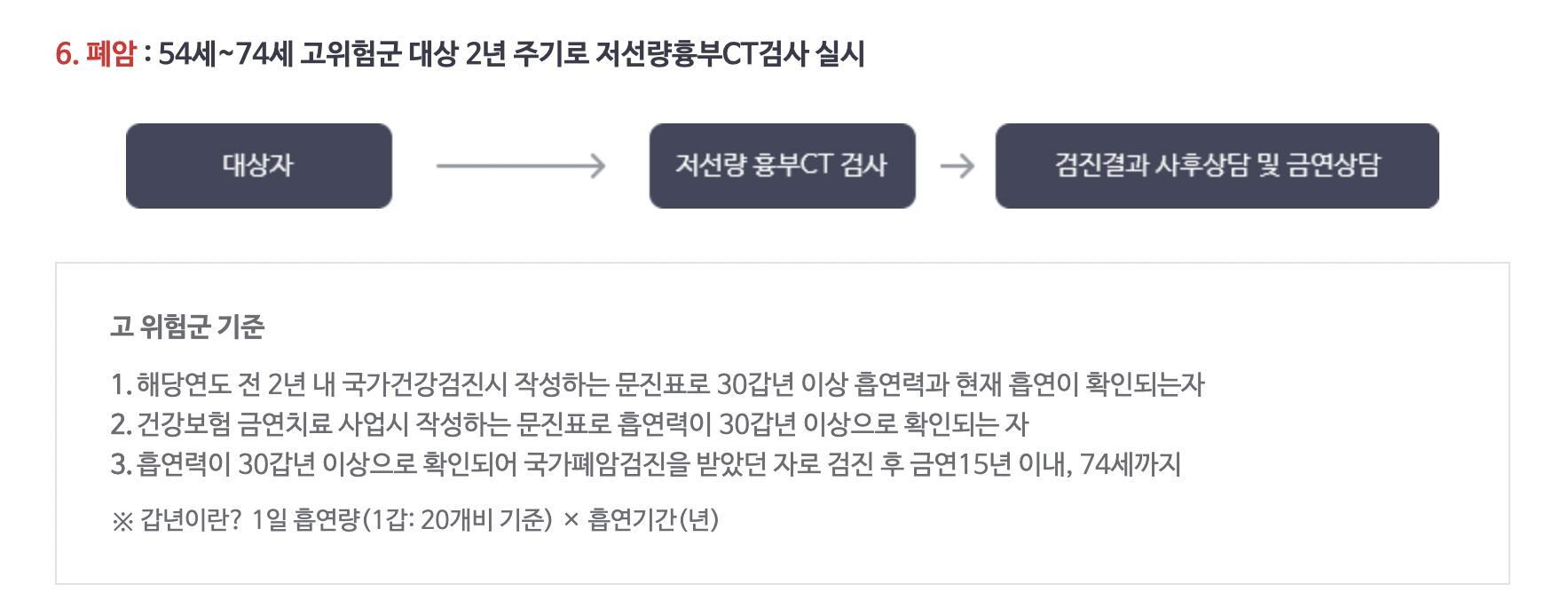 폐암의 경우 54세 ~ 74세 고위험군 대상으로 2년 주기로 저선량흉부 CT검사를 실시합니다.
