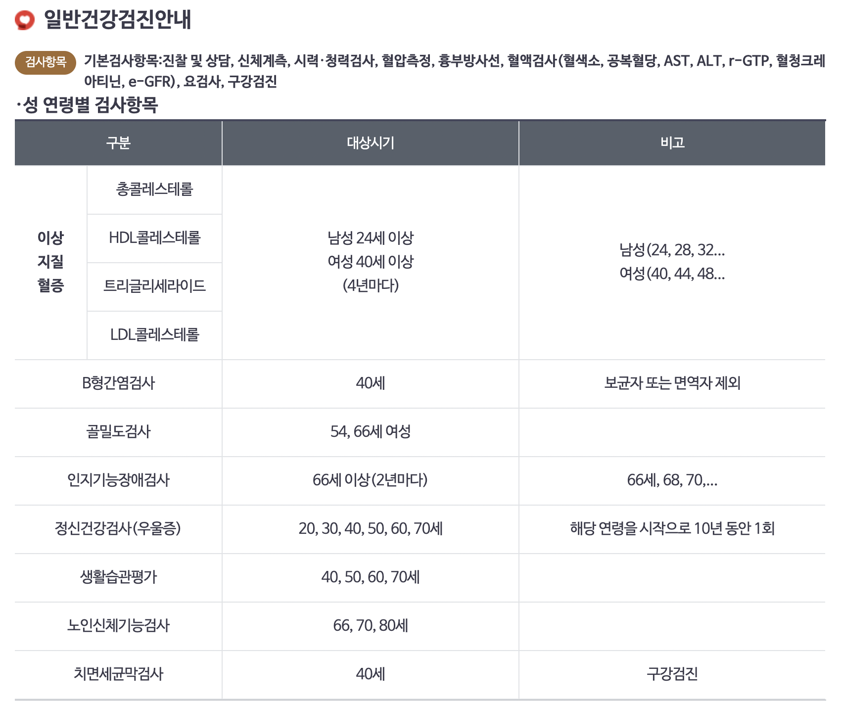 기본검사 외의 항목인 이상지질혈증, B형간염검사, 골밀도검사, 인지기능장애검사, 정신건강검사(우울증), 생활습관평가, 노인신체기능검사, 치면세균검사 항목의 경우에는 각 대상시기와 주기가 각기 다르니 아래 표를 참고하면 됩니다.