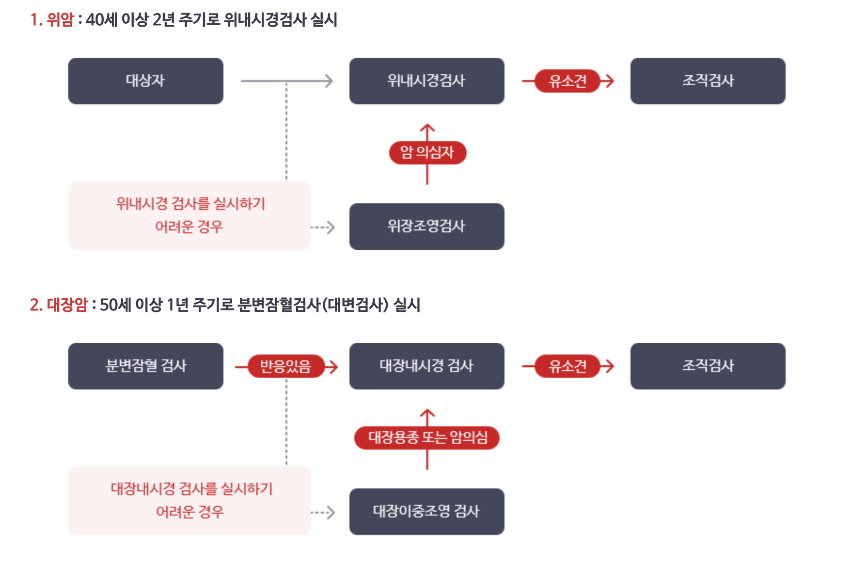 대장암은 50세 이상부터 검진을 실시하며 1년 주기로 분변잠혈검사(대변검사)를 합니다. 2단계 검진은 분변잠혈검사 결과 잠혈반응 있음으로 나오는 사람에 한해 실시합니다. 분변잠혈검사를 실시하지 않고, 대장 내시경을 받은 경우에는 검사 비용을 전액본인이 부담해야 합니다.