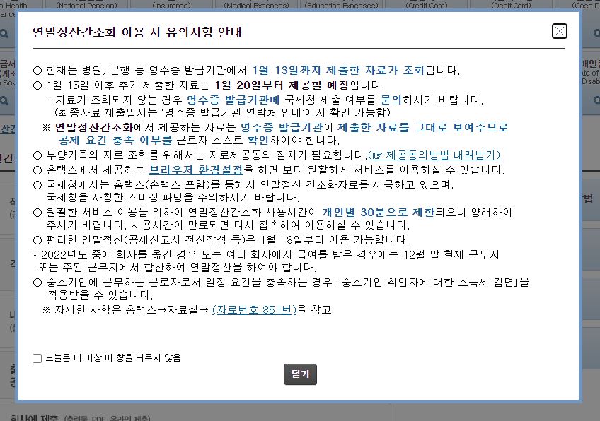 혹시 1월 15일에 제공되지 않는 세부 내역이 있다면 영수증 발급기관에 국세청 제출 여부를 문의해 보고, 1월 20일 이후에 연말정산 간소화 서비스를 다시 한번 더 확인을 해보는 것이 좋을 것 같다.
