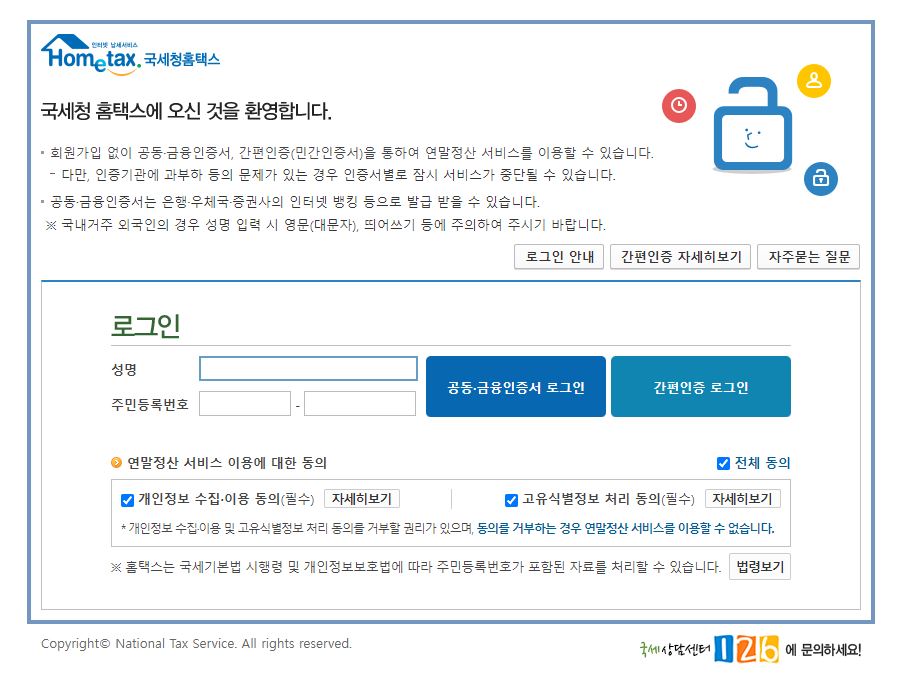 성명과 주민등록번호를 적고, 공동 또는 금융인증서로 로그인을 하거나 간편인증을 통해 로그인이 가능하다.