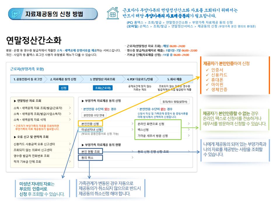 연말정산 시, 미성년 자녀가 있거나 부모님을 부양가족으로 인적공제를 받을 경우, 반드시 부양가족의 자료제공동의가 필요하다. 위의 내용을 참고하여 부양가족 자료제공 동의를 신청하면 된다.